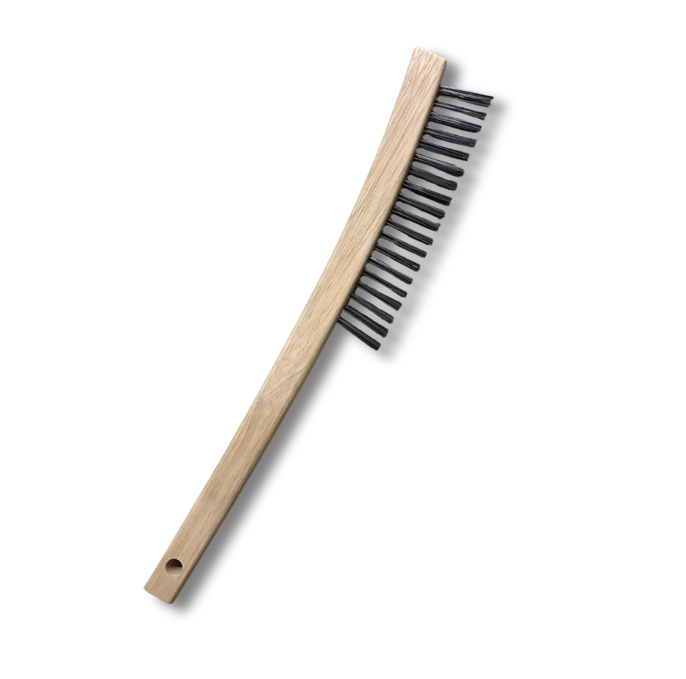 The 14” Curved Handle Wire Scratch Brush is a powerful cleaning tool designed for tough jobs. Featuring stiff tempered steel flat wire bristles in a 3x19 row configuration, it aggressively removes rust, corrosion, dry paint, and debris from metal surfaces. The curved wooden block provides a comfortable grip, while the built-in hanger hole allows for easy storage. Ideal for cleaning grills, heavy-duty scrubbing, and distressing wood for projects.