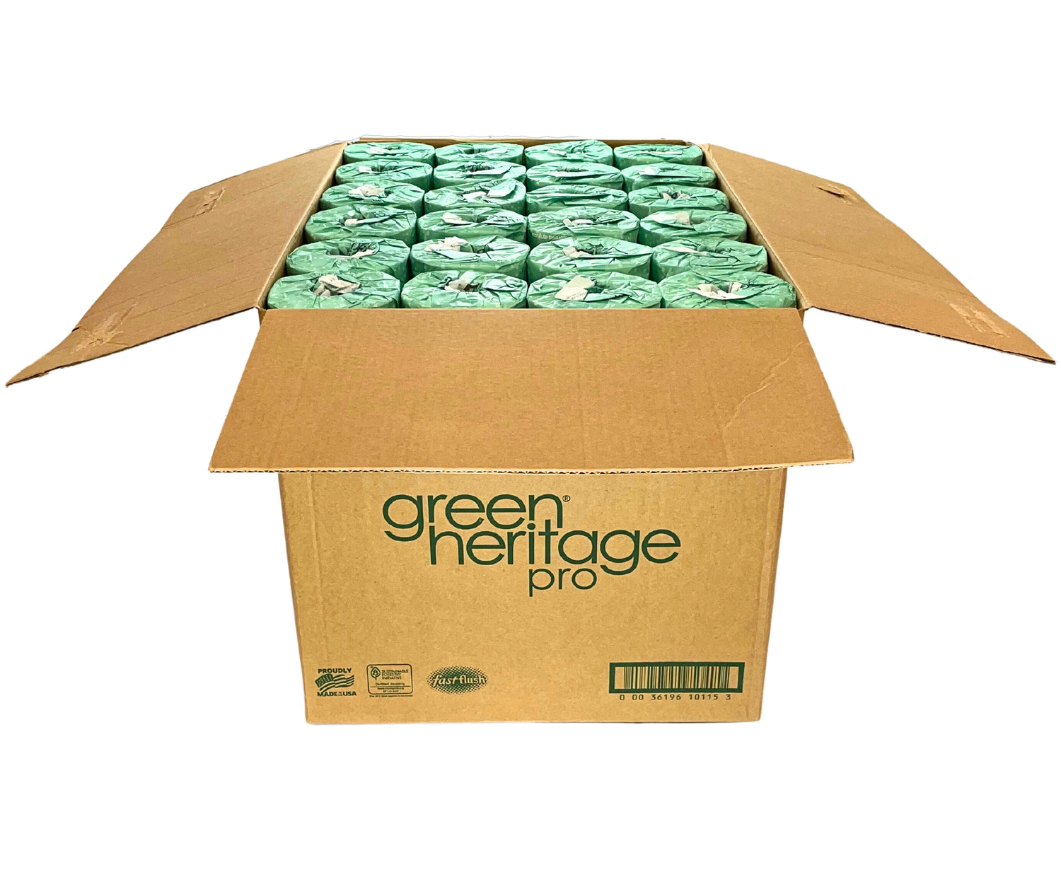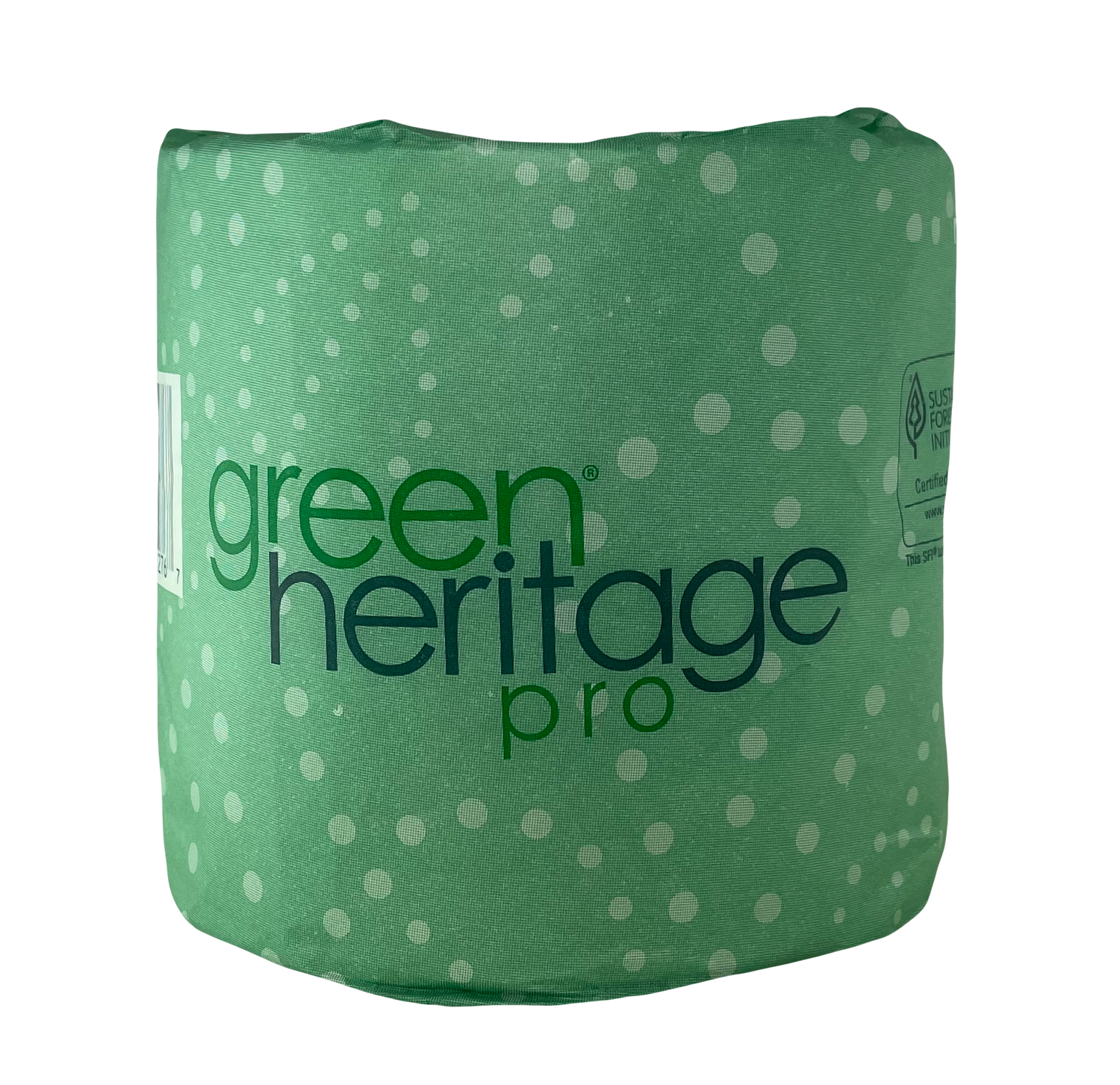 A: Green Heritage™ Bathroom Tissue is made from 100% recycled fiber, which helps conserve trees and reduce the environmental impact of traditional toilet paper production. Additionally, Atlas Paper Mills follows sustainable manufacturing practices, including energy and water conservation.